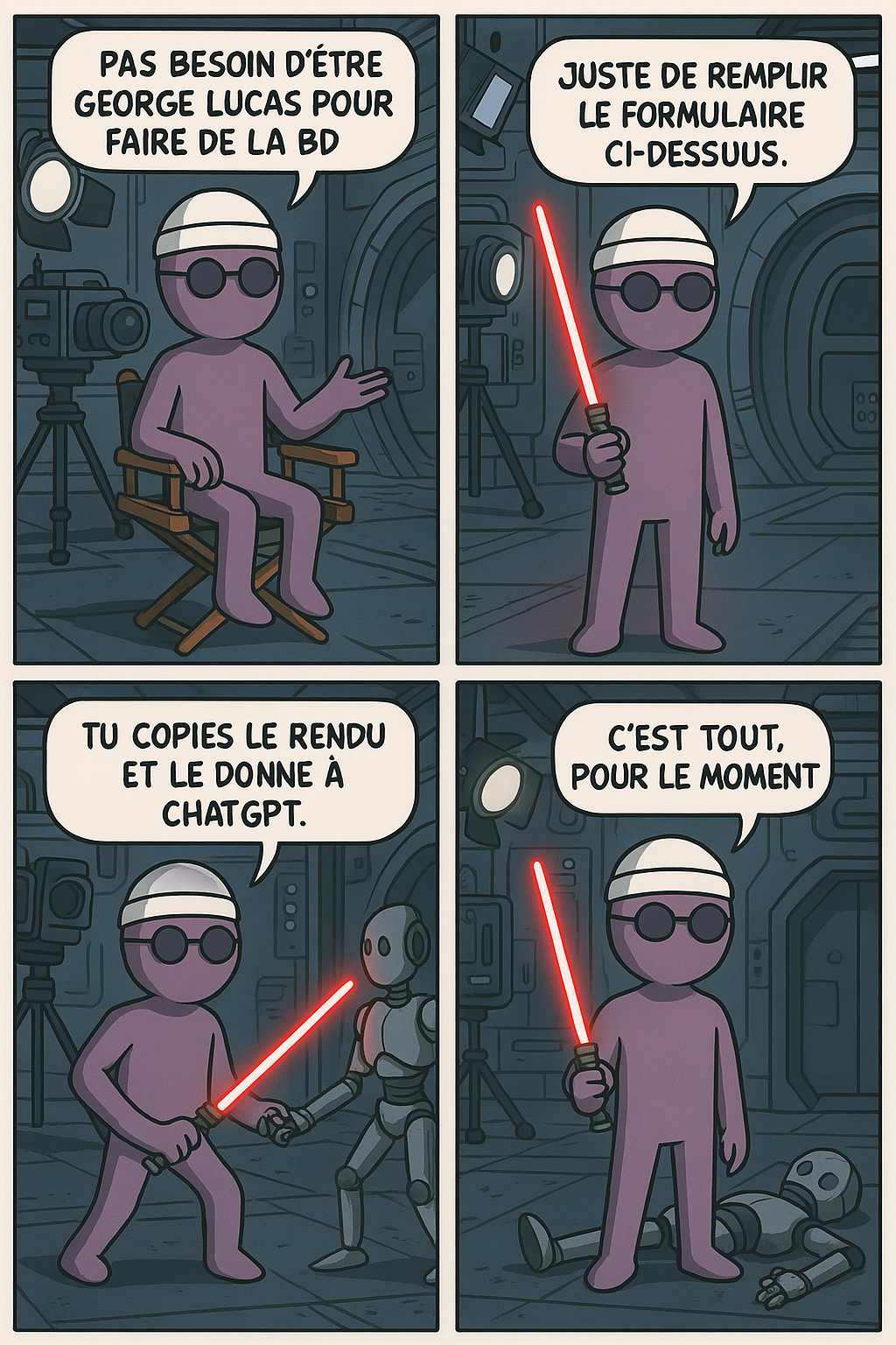 Remplis les champs ci-dessous pour générer ton prompt personnalisé pour demander des idées de BD 4 cases impactantes.
