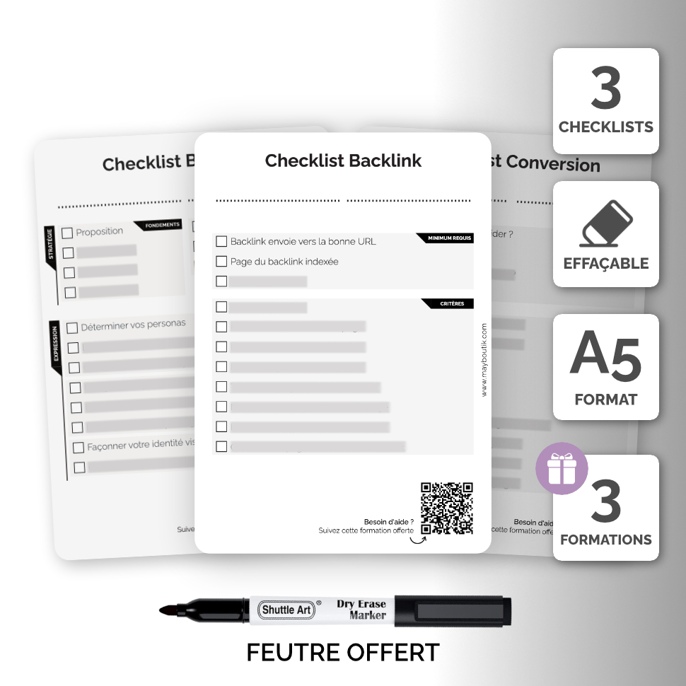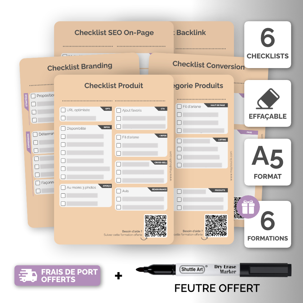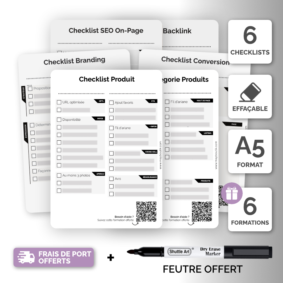 Pack contenant les checklists Backlink, SEO On-Page, Produit, Catégorie Produit.