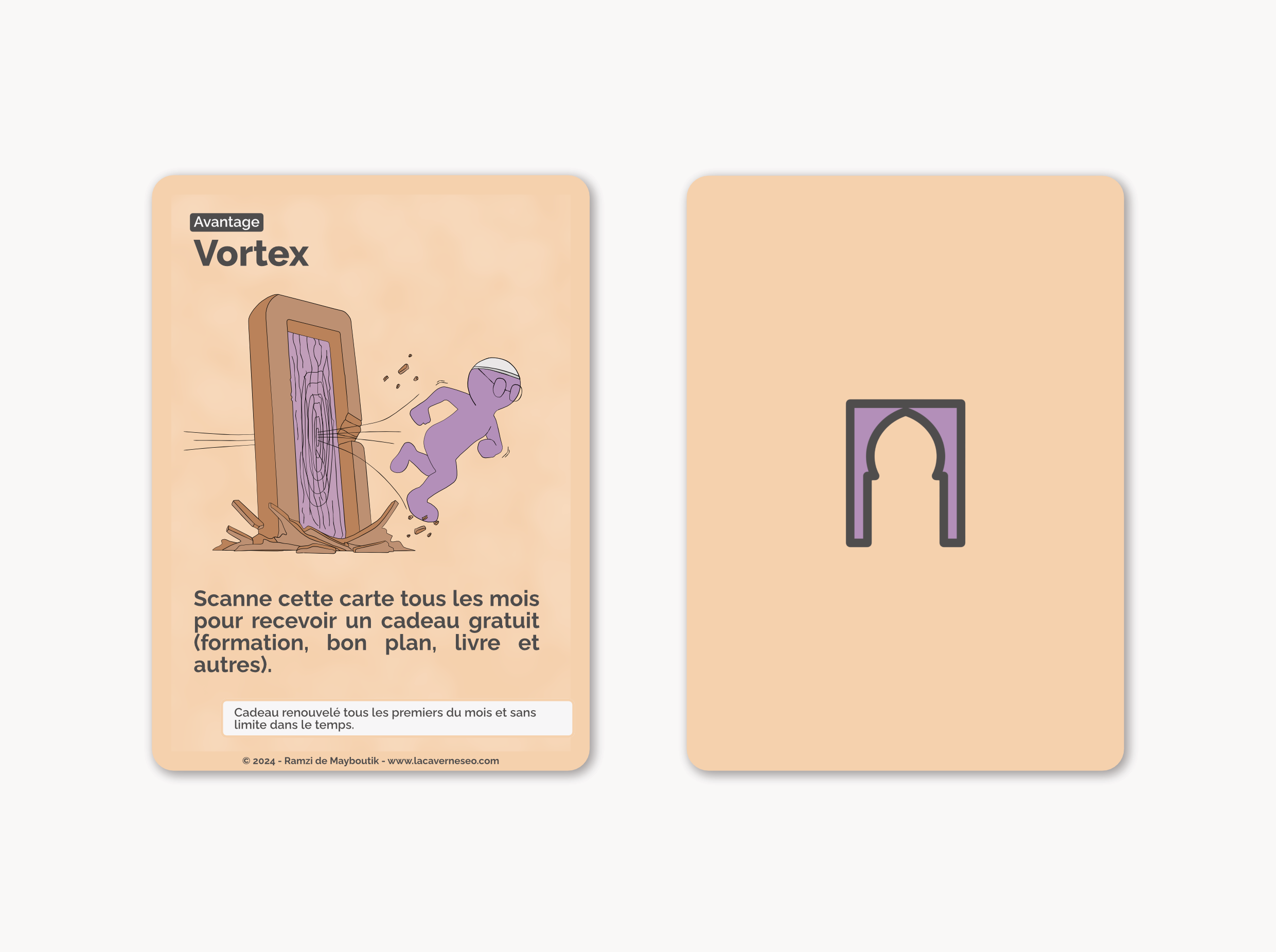 La 1ère carte révélée est la carte Vortex (Avantage) qui vous permet d’avoir un cadeau par mois quand vous la scannez.